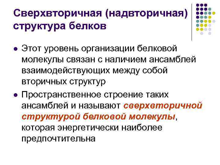 Сверхвторичная (надвторичная) структура белков l l Этот уровень организации белковой молекулы связан с наличием ансамблей взаимодействующих между собой вторичных структур Пространственное строение таких ансамблей и называют сверхвторичной структурой белковой молекулы, которая энергетически наиболее предпочтительна